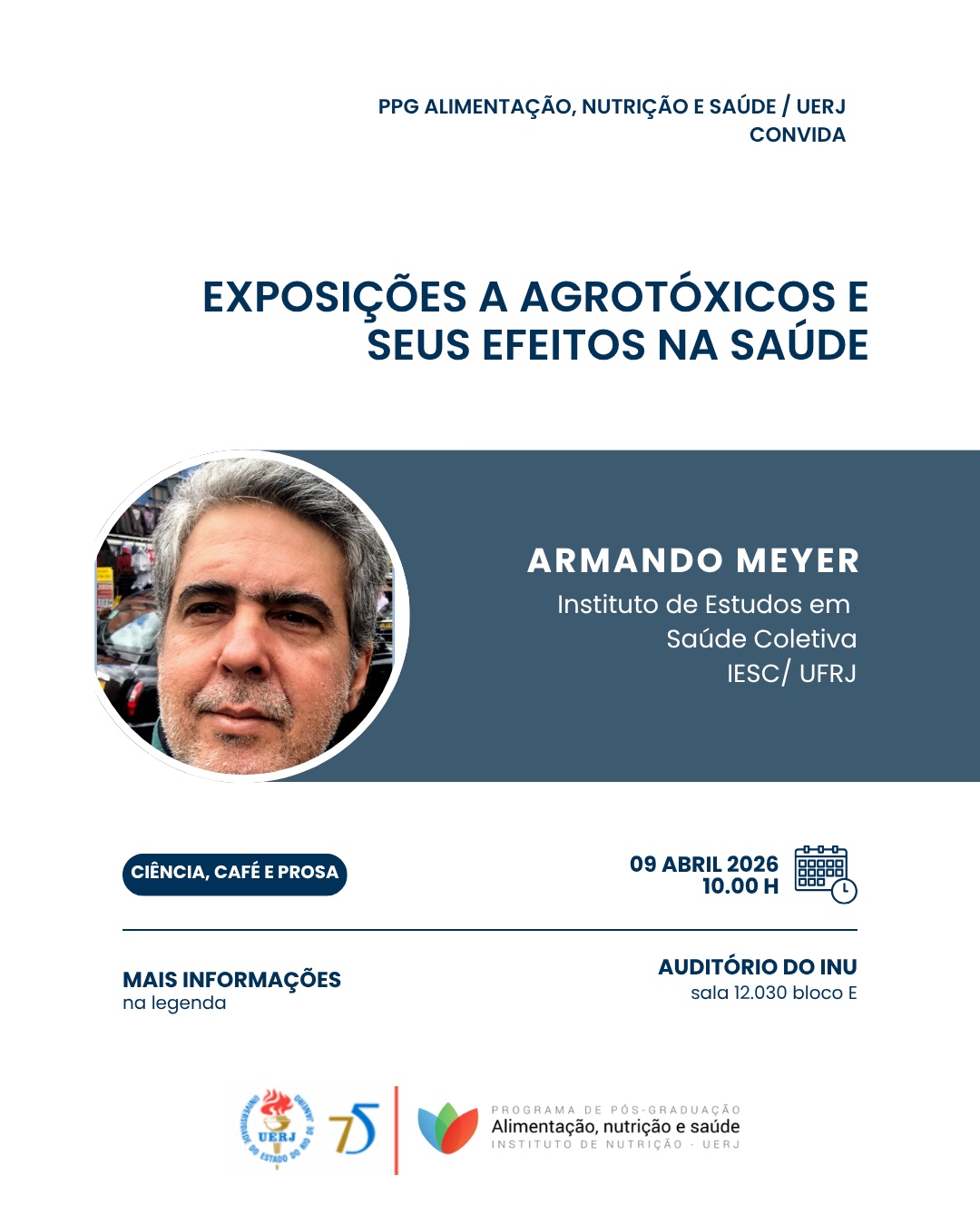 “Ciência, café e prosa” é uma iniciativa do PPG-Alimentação, Nutrição e Saúde da UERJ. As sessões acontecem sempre às 5as feiras às 10h no Auditório do Instituto de Nutrição (sala 12030 E) e são abertas à comunidade acadêmica.