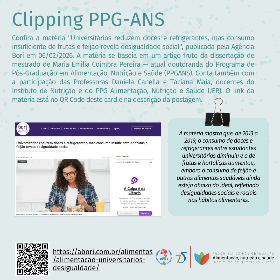 Dia 18/03/2026, às 10 horas, convidamos a todos(as) para a palestra "Efeito da existência e qualidade das legislações locais sobre o ambiente alimentar escolar e o consumo de alimentos ultraprocessados de adolescentes das capitais brasileiras", atividade final do pós-doutorado de Ariene Silva do Carmo, sob supervisão da professora Daniela Canella. A palestra acontecerá no Auditório do Instituto de Nutrição UERJ e é aberta a todos e todas.